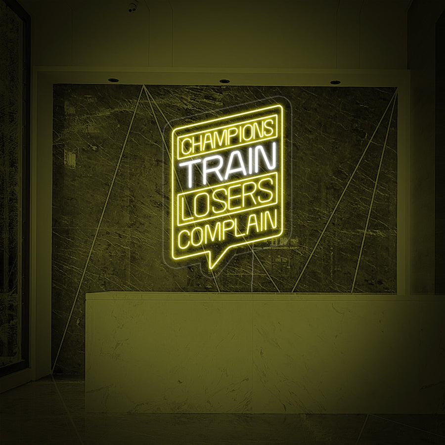 "Champions Train Losers Complain Kuntosalille" Neonkyltti