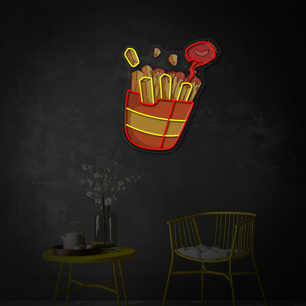 "Ranskalaiset perunat chilikastikkeella, pikaruokalla" UV-tulostettu LED-neonkyltti